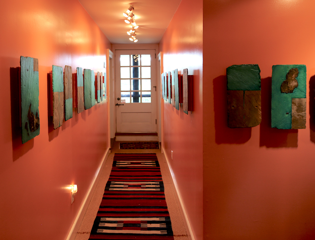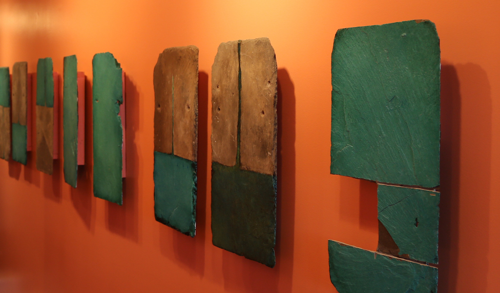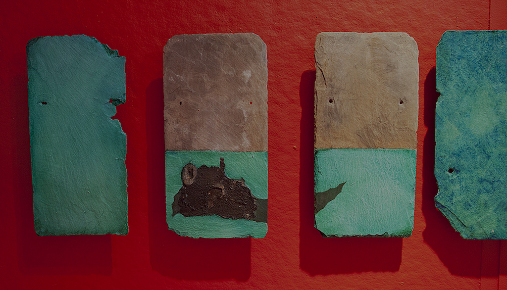 JS-Horseman, Cuneiform 26, Oil Shellac, Engraving/Carving, Natural Decay on Slate Tiles, Installtion in Lyme CT, 2013JS-Horseman, Cuneiform 26, Detail, Oil Shellac, Engraving/Carving, Natural Decay on Slate Tiles, Installtion in Lyme CT, 2013