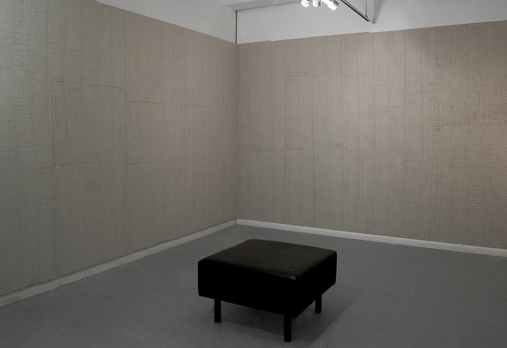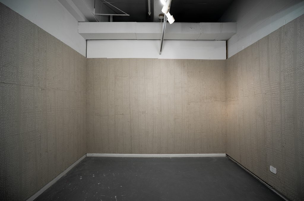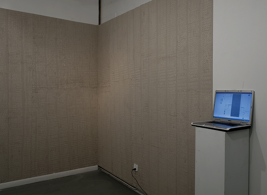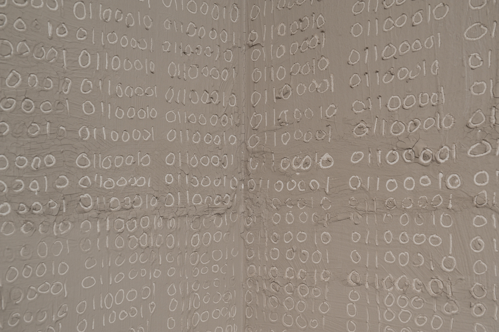 JS-Horseman, Sanctuary (a b); Original Installation, Michael Sickler Gallery, Syracuse NY, Clay, Binary Code, Computer Generated Sound, Blue Light, 2014